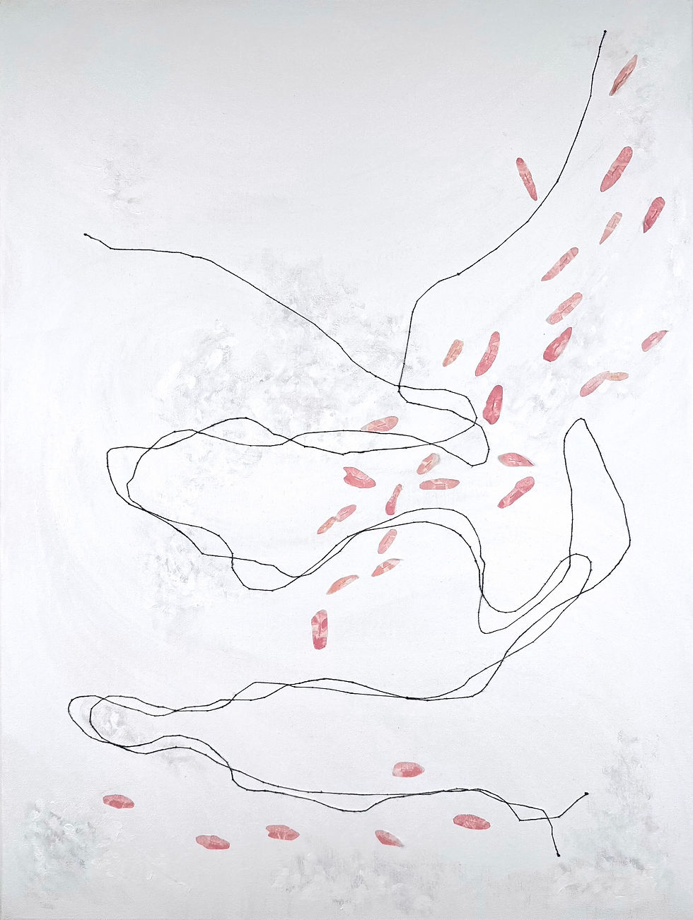 The layered use of embroidery, acrylic, and paper creates a textured surface that holds both lightness and depth. Scattered paper elements resemble fallen petals, fragile remnants of something once in bloom, now dispersed. These visual metaphors evoke a state of bittersweet melancholy, where sadness and peace exist side by side.